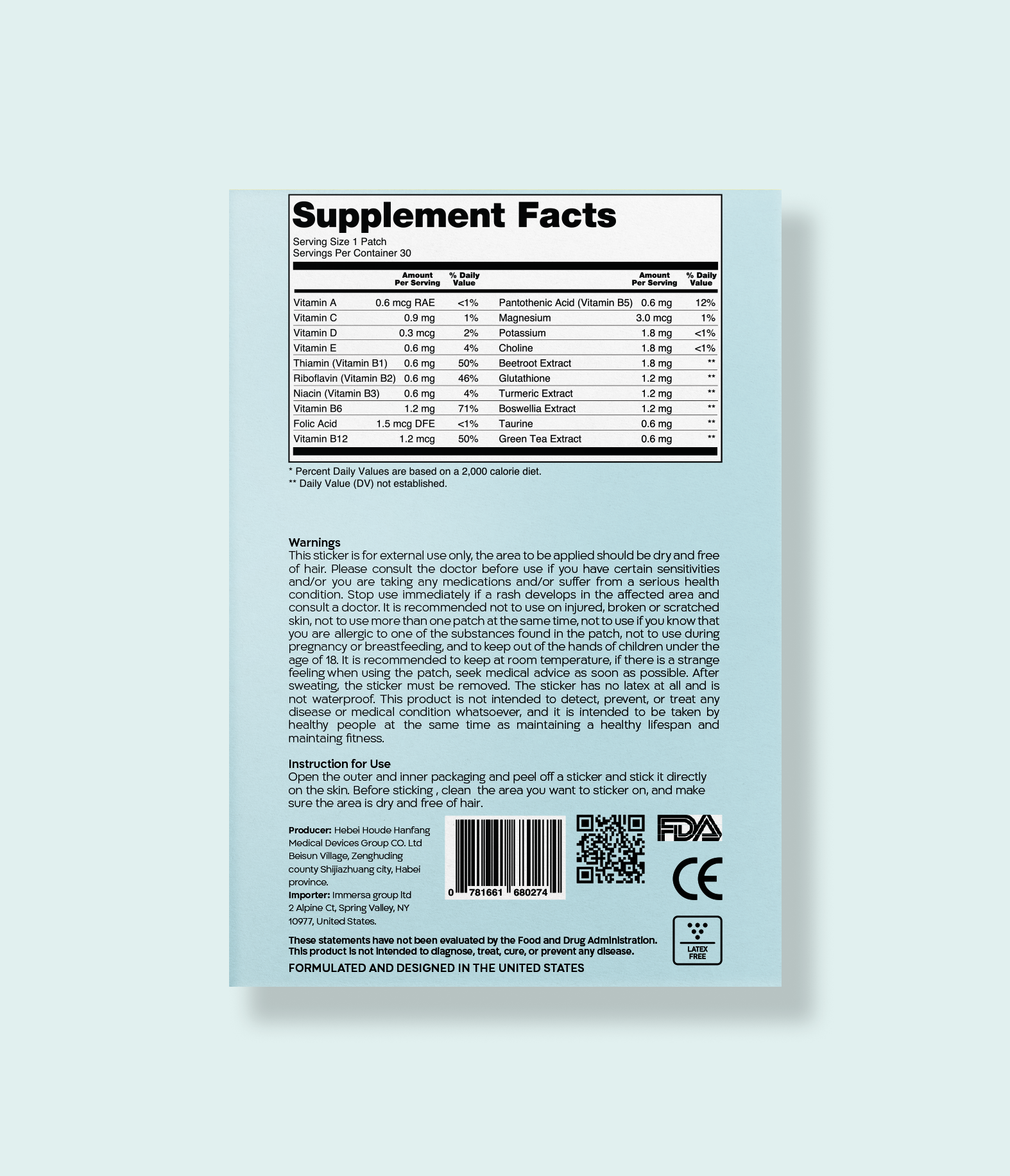 For days when your body needs a little extra support, this is your go-to patch for renewal from within. Infused with vitamins A, C, D, E, and a complete B-vitamin complex, it’s designed to help your body rebuild, recharge, and restore energy after physical or mental strain. Whether you’re coming off an intense workout, a long day, or simply need to feel like yourself again, RecoverWell delivers targeted nutrients to support immune function, cellular repair, and natural recovery. A clean, wearable solution for daily resilience.
